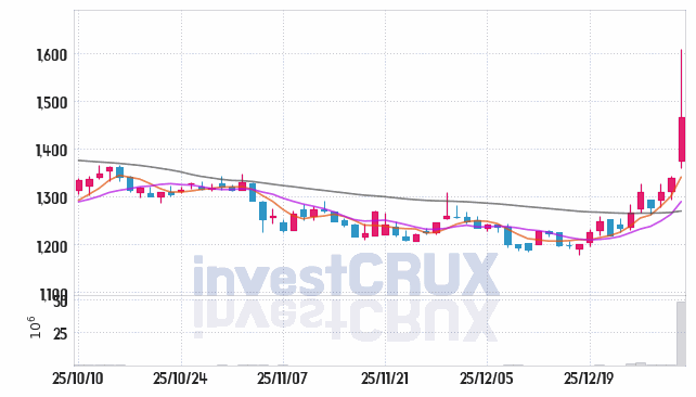 고가와 저가는 전일 종가에 비해서 각각 271원(20.2%), 21원(1.6%) 차이가 있는 것으로 분석됩니다.