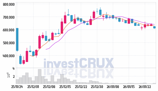 반대로, 5일간 주가 데이터 중 가장 높은 저가는 26년 01월 20일에 기록했던 630,000원인 반면 최저 저가는 26년 01월 21일에 거래되었던 596,000원입니다.