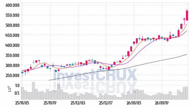 반대로, 5일간 주가 데이터 중 가장 높은 저가는 26년 01월 29일에 기록했던 500,000원인 반면 최저 저가는 26년 01월 23일에 거래되었던 434,500원입니다.