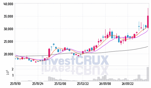 시가 : 30,400원, 고가 : 38,250원, 저가 : 29,800원